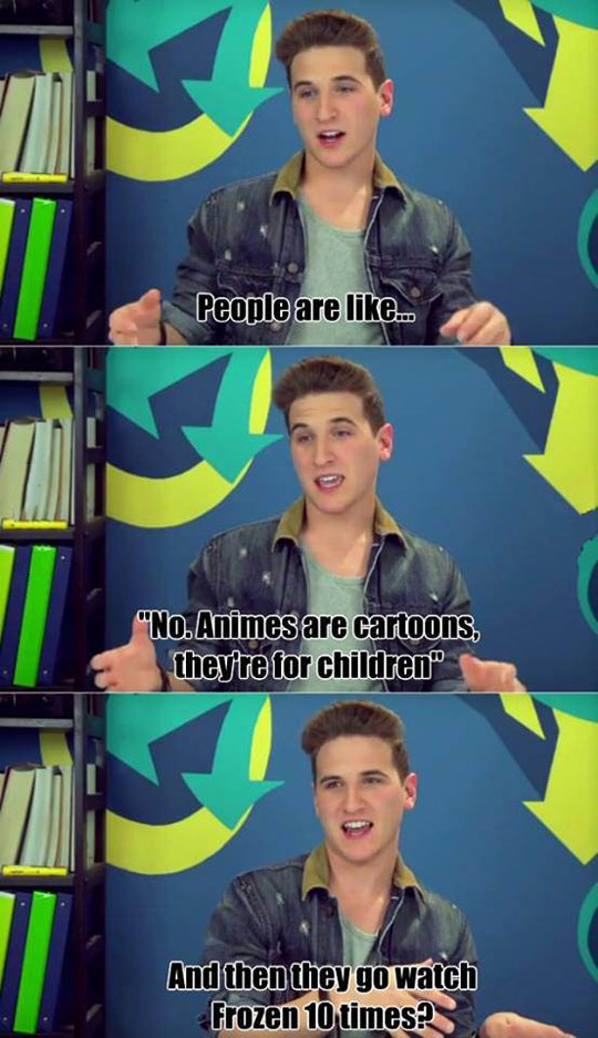Second, as the speaker in the picture clearly knows, Frozen is made for a child audience. However, I would argue that the very fact that Frozen is so popular, even among adults, is powerful evidence that films can be made that are enjoyable for a wide age range of people.