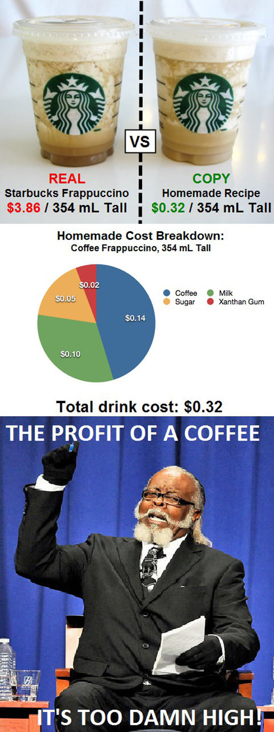 Assuming I’m at all accurate in my educated guessing, we can still argue that Starbucks Frappuccinos are overpriced, but if we’re being fair, they most likely only cost about one dollar more than they should, not over three dollars more, as the picture claims.