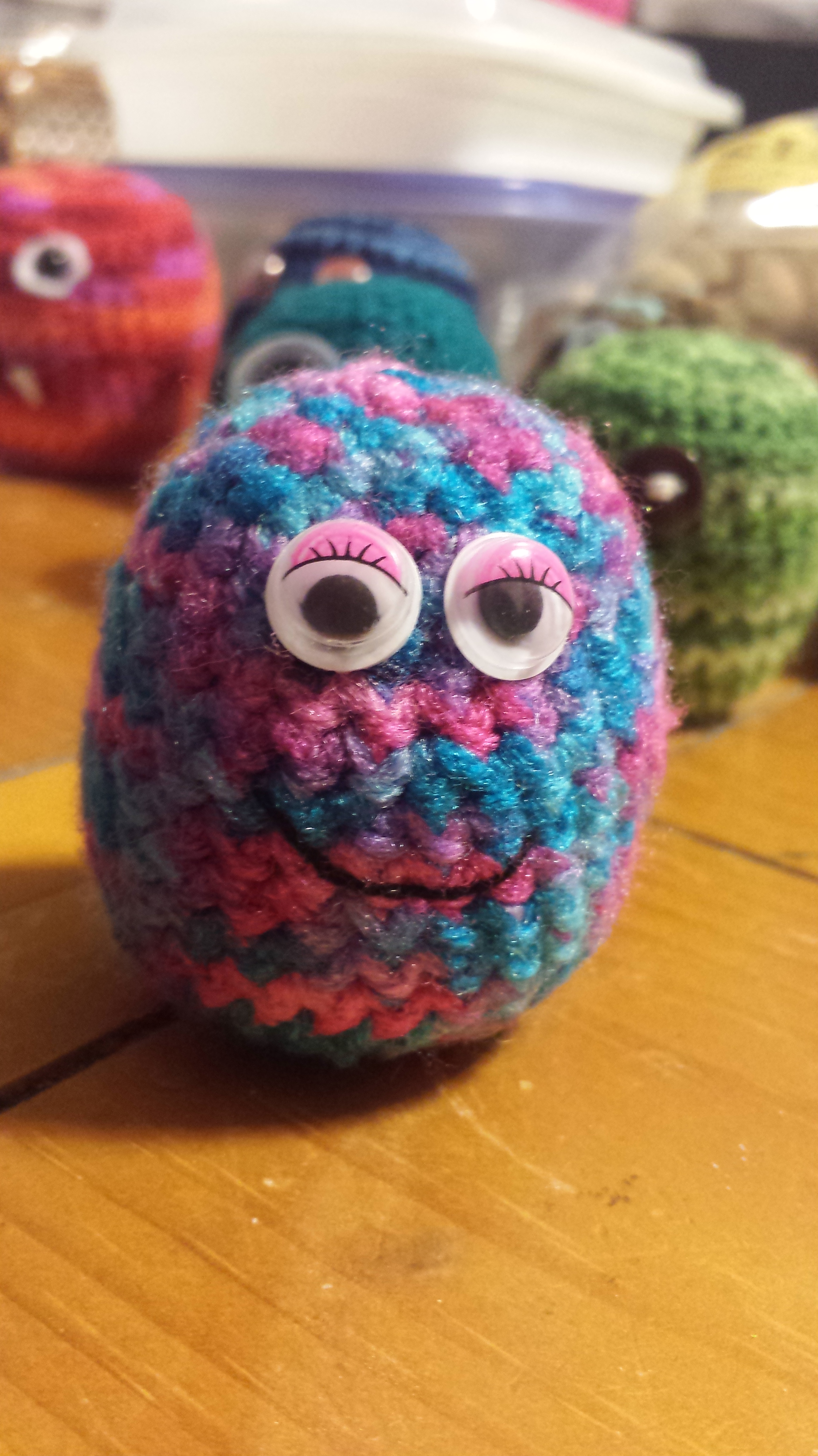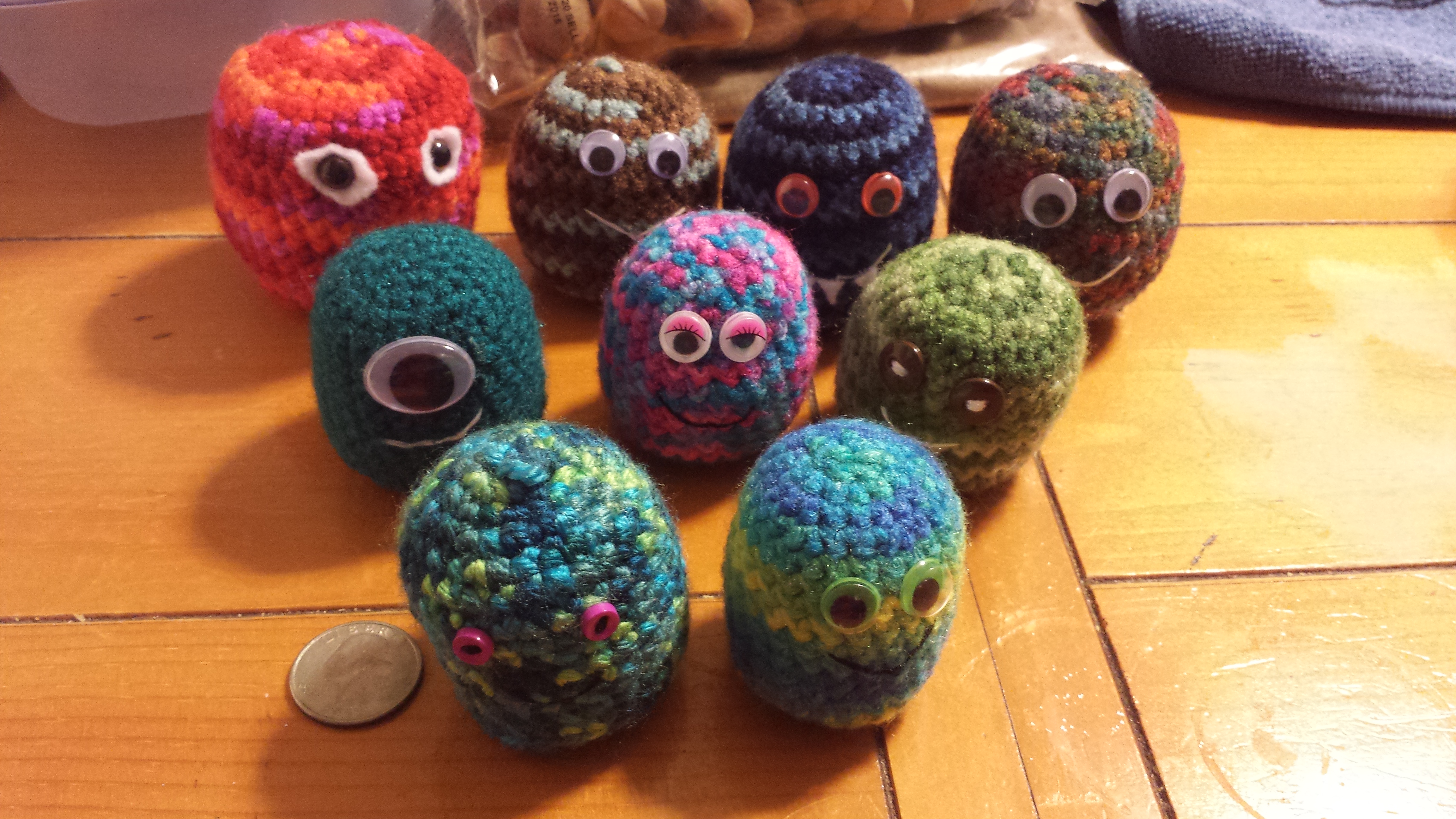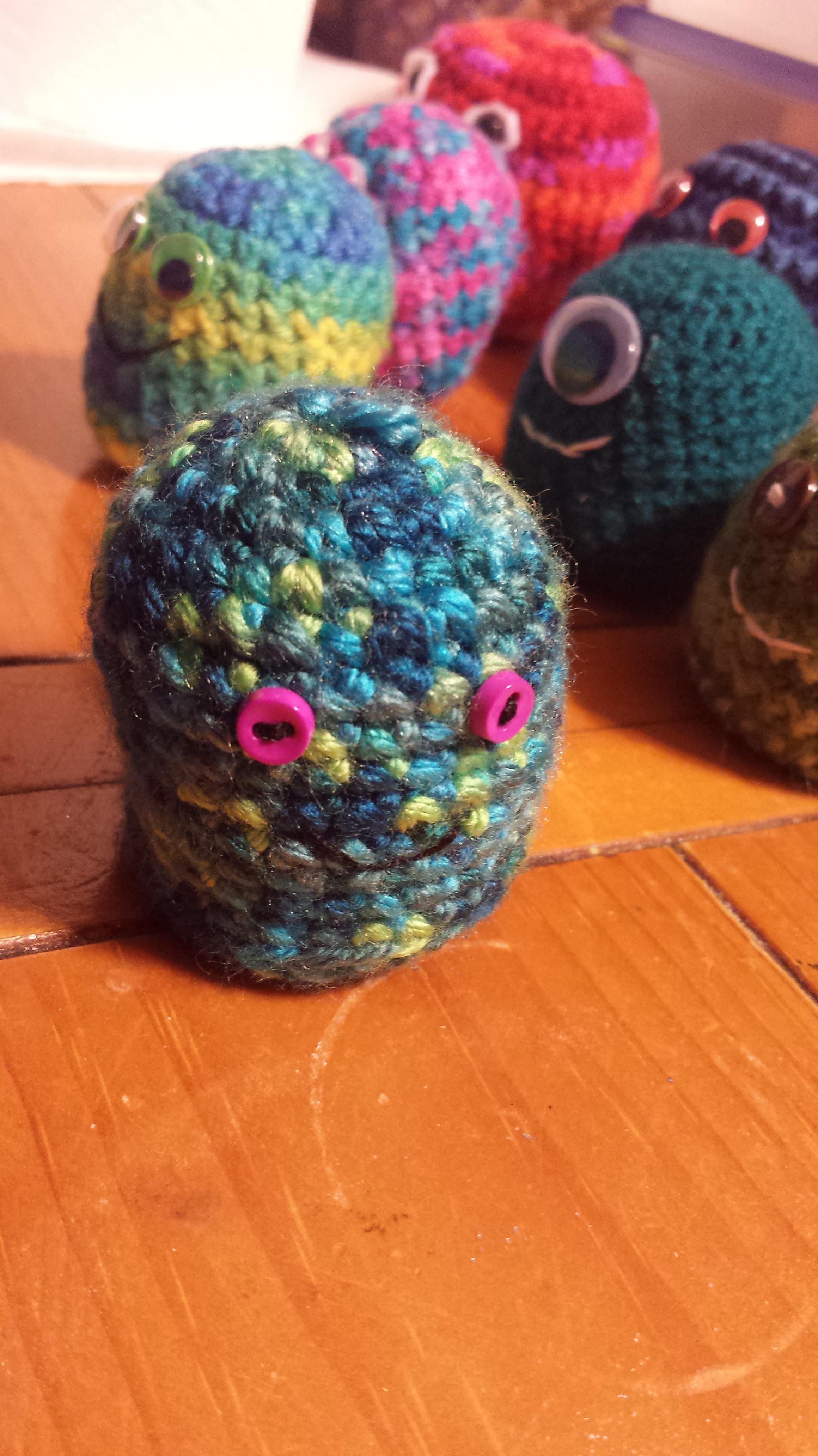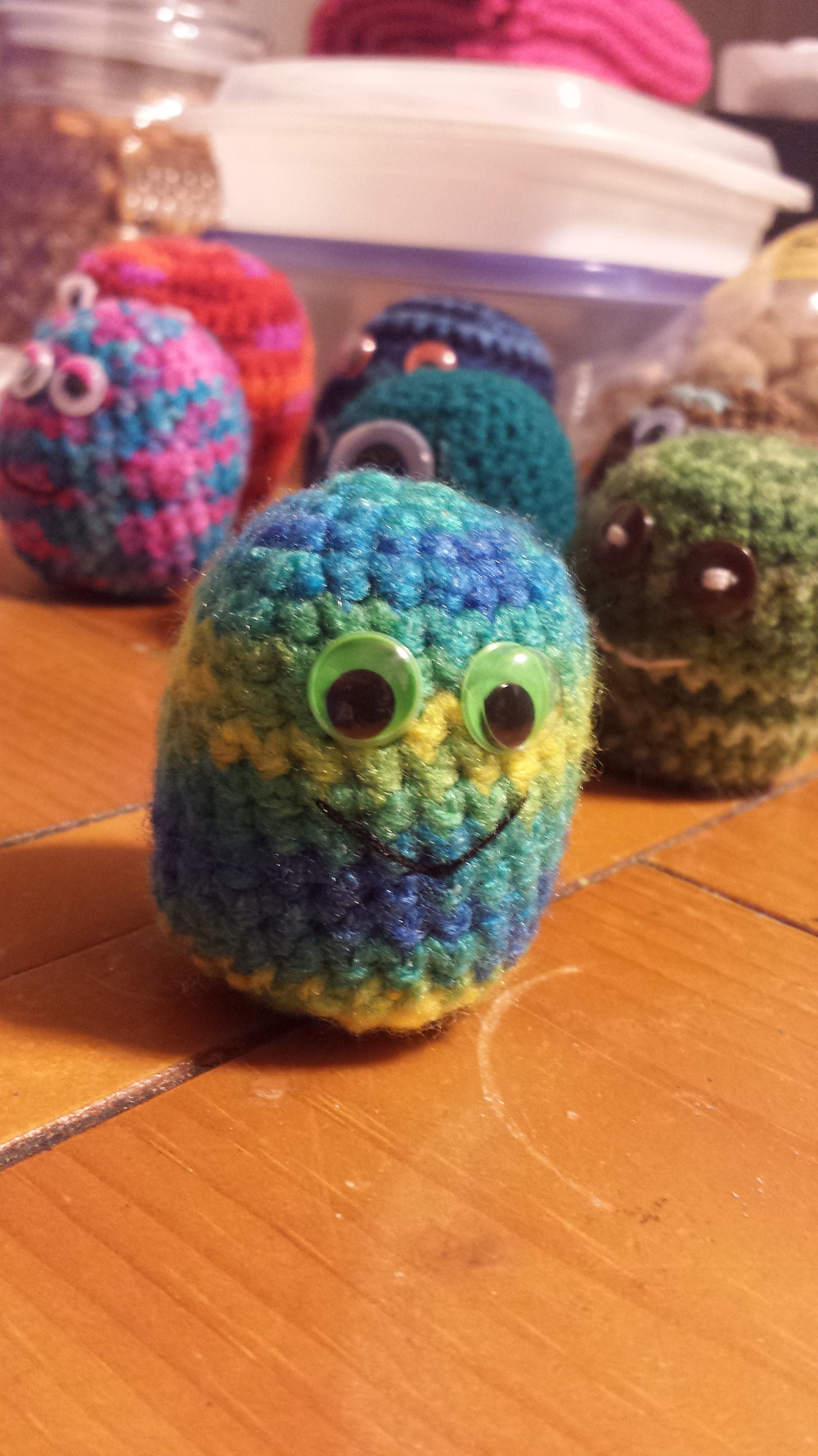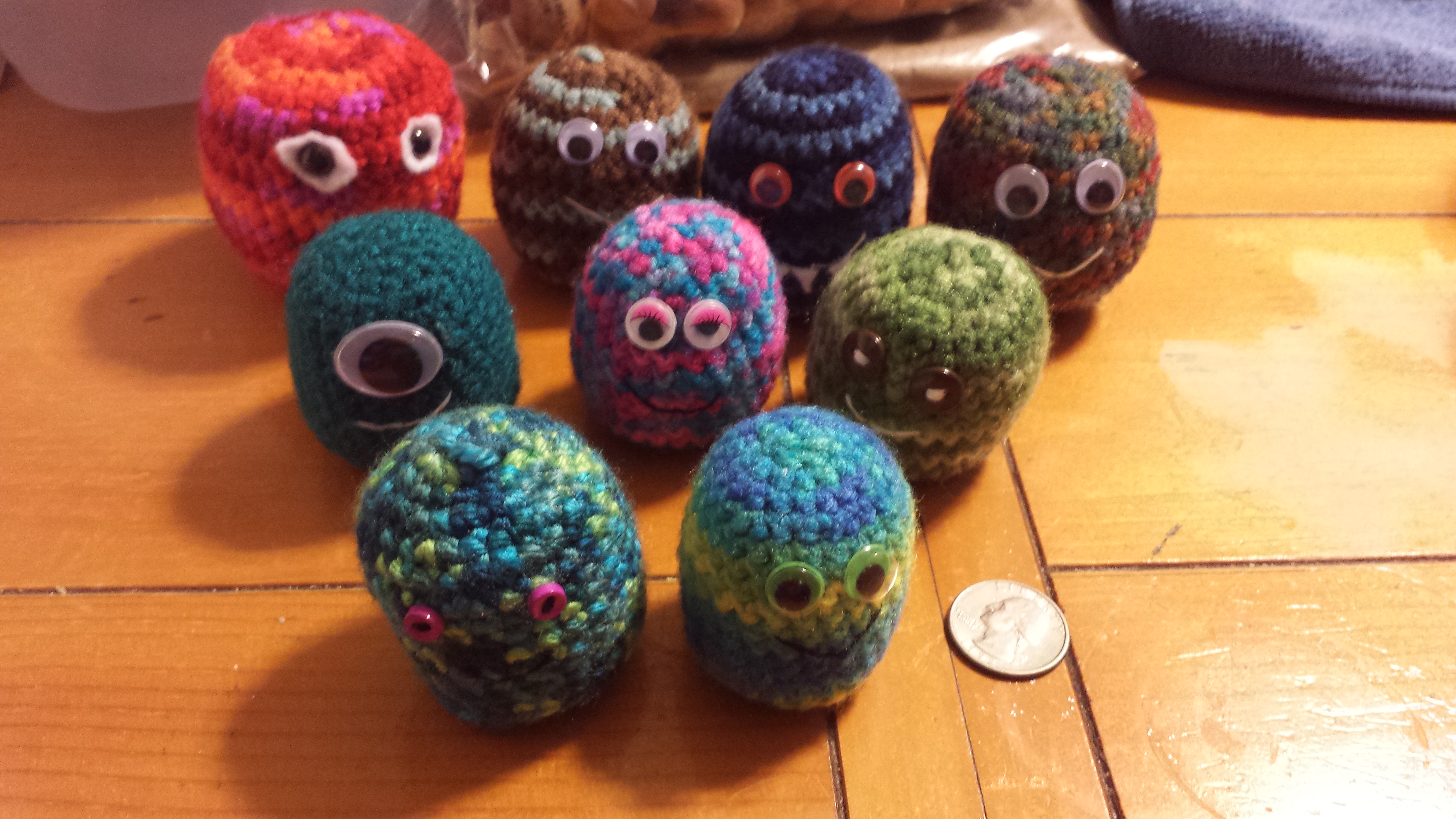 This is the first one I made; he lives on my monitor at work. I did not stuff him well enough, and he is inside out. The others are all better!This is the other blue/green/yellow yarn I used. This is Red Heart Super Saver brand yarn, like many of the others.There is great variety of googly eyes available now. Pretty awesome. Check out those eyelashes!I think the button eyes are a bit weird. I’ll have to experiment with using felt circles behind the buttons so they look like pupils.I think this one looks like camo. Kinda.Another very masculine color. Most of my co-workers are men, because I’m a programmer.This one is my favorite, so I gave it to the guy who had the roughest year. It can’t help much, but at least he has more desk friends.This one turned out to be a super fatty. I’m not sure what happened. I do like the safety eyes look, though. Googly eyes are easiest, but safety eyes are probably nicest.The last one! And the only one I made with a solid color instead of a variegated yarn. I enjoy working with the multi-colored yarn, but it’s nice to make solid color things, too.Group shot! With quarter, for scale. These are about two inches tall, so not very big, but they are about a handful each.