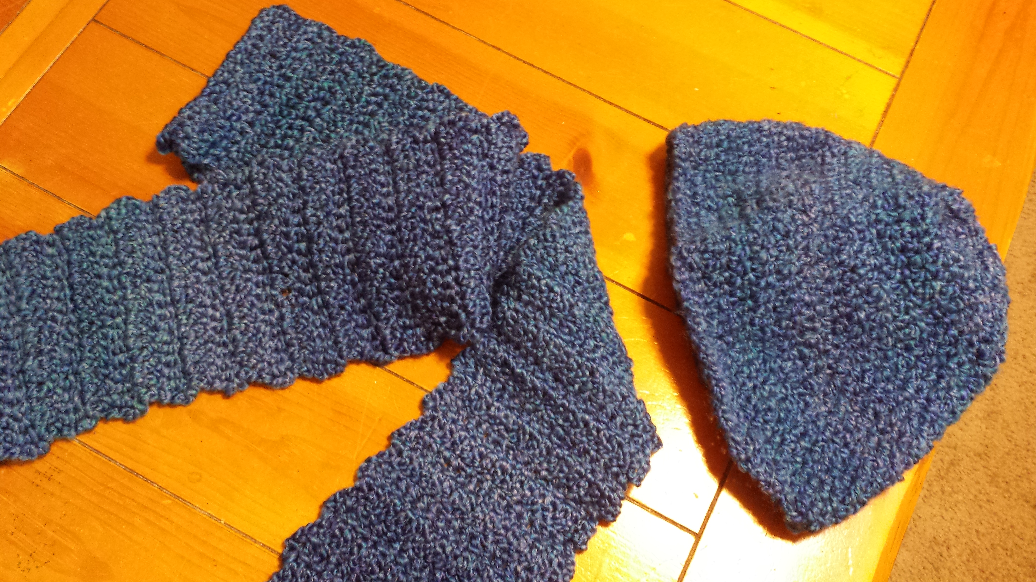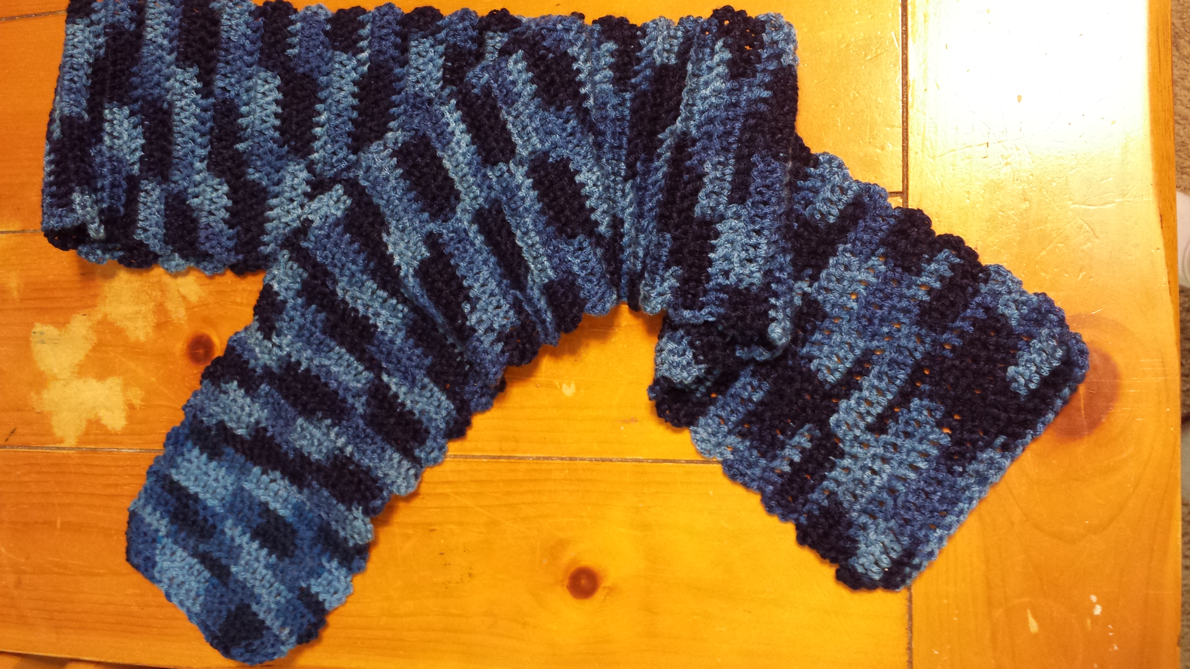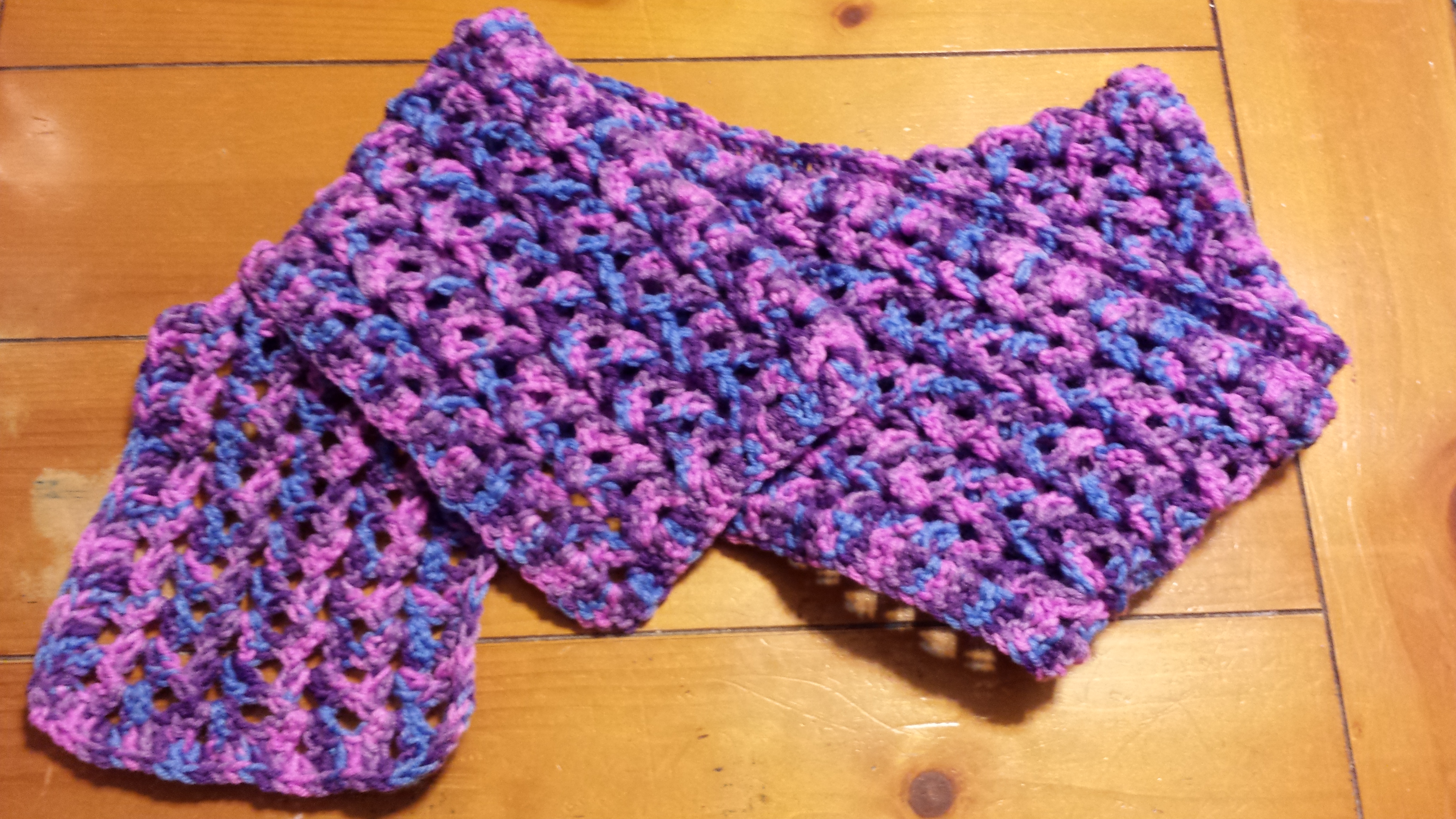 Pattern on ravelry. I turned the hat inside out because I thought it looked better that way. I hated working with this yarn, but it came out pretty nice, I think.This is just double crochet, over and over and over. I used a variegated yarn, so it looks pretty nice even though there is no real pattern.I liked this pattern so much, I made two. It’s called a Joseph’s scarf, and is on ravelry here.This is the other Joseph’s scarf.I love this color, and I’m a fan of this pattern, which you can find on ravelry here. However, I did not find it to be very well-written, and I had to study the pictures to figure out what to do.Here is another scarf I made of the same pattern, this time with a variegated yarn. I think this particular pattern is better with a solid color, but it turned out alright.This pattern is called the Artfully Simple Infinity Scarf. I think it came out nicely, although twistier than I would have hoped. If I do the pattern again, I’ll be aware of that and act accordingly.