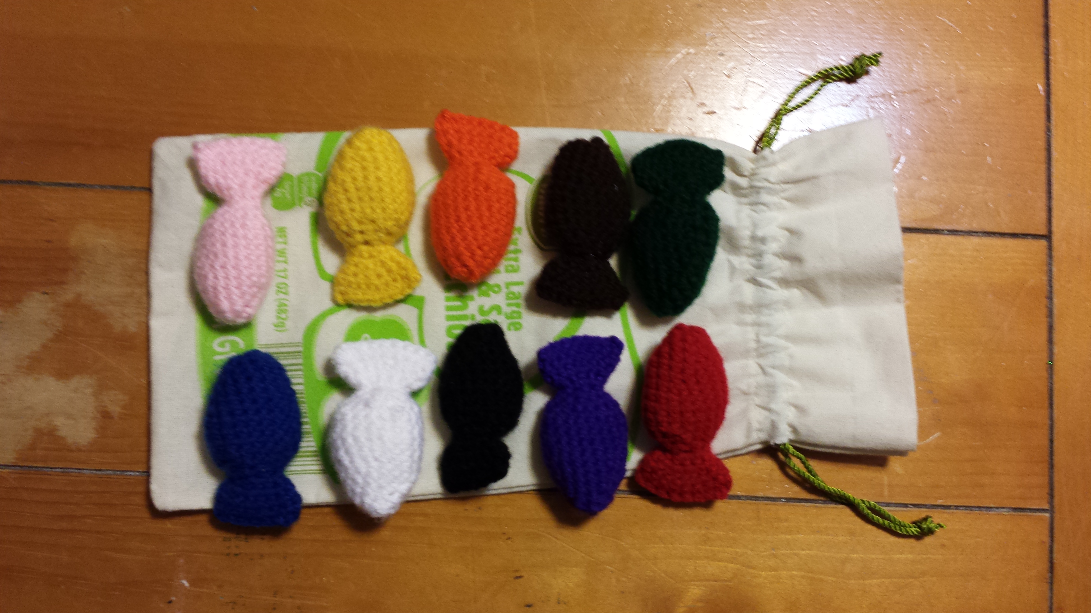 A princess crown for a toddler niece. Pattern on ravelry.A ninja/ski mask for one of my nephews. Unfortunately, it came out too small and I’ll be redoing it this week. Here is the pattern I used. I modified it to leave out the mouth.A bookmark shaped like a tie. Pattern on ravelry.This is a learning toy, to teach counting and colors. Pattern on ravelry.Close up of fishes.Other fishes close up.