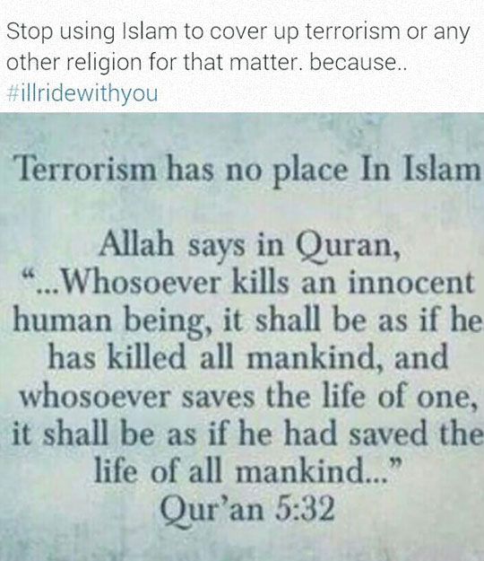 Maybe some religions cannot reasonably be used to justify terrorism. Christianity makes it a lot harder, if you ignore the Old Testament especially. Jainism makes it basically impossible, to the best of my knowledge. But for Islam, the Qur’an orders violence, repeatedly and clearly. Terrorism has lots of place in Islam.